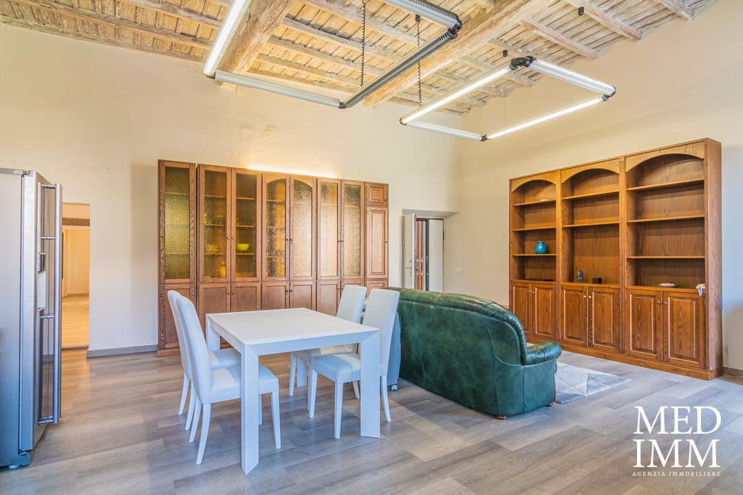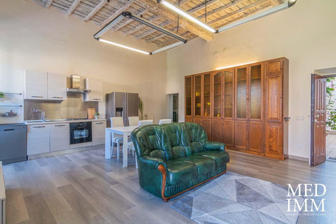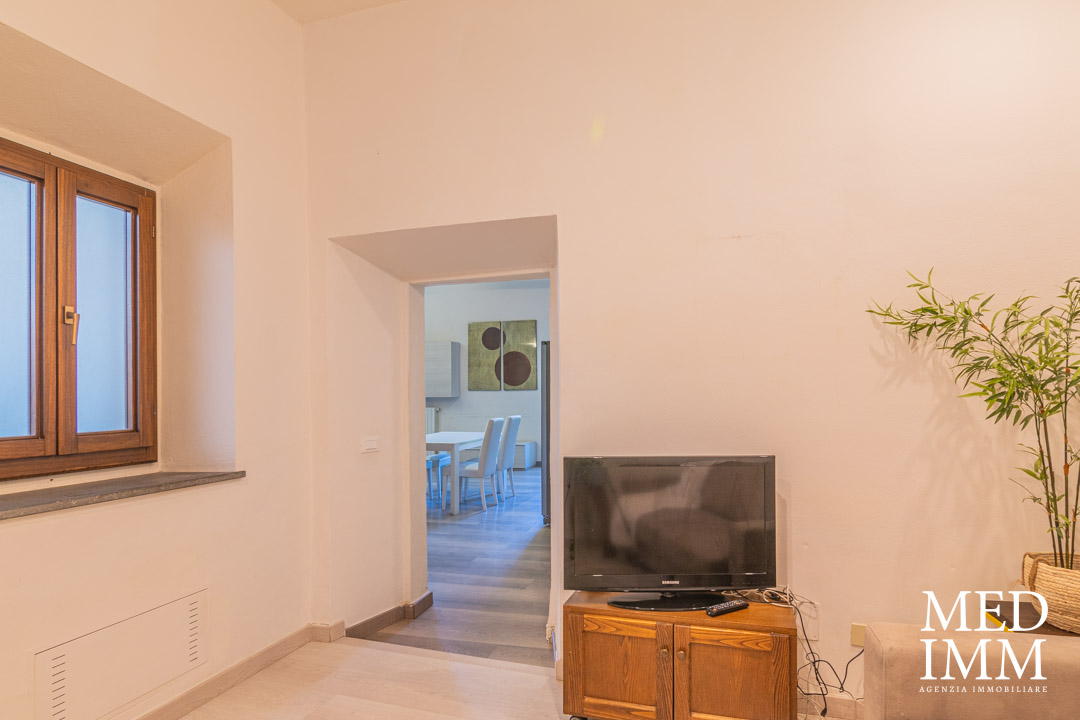 All’ingresso si trova l’ampio soggiorno con cucina a vista e piccolo balcone che regala un piacevole affaccio proprio sulla piazza e sulla Rocca Albornoz, sede del Museo Archeologico Nazionale.
