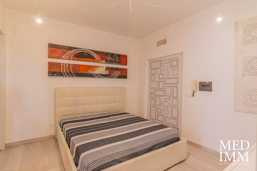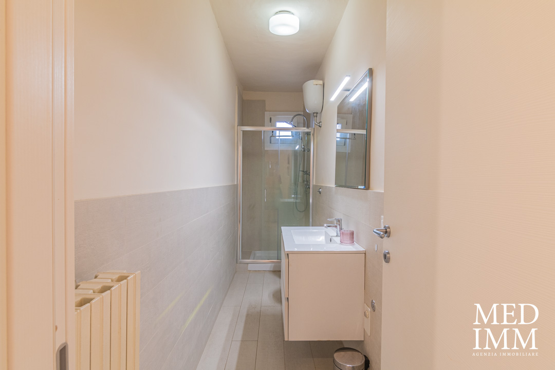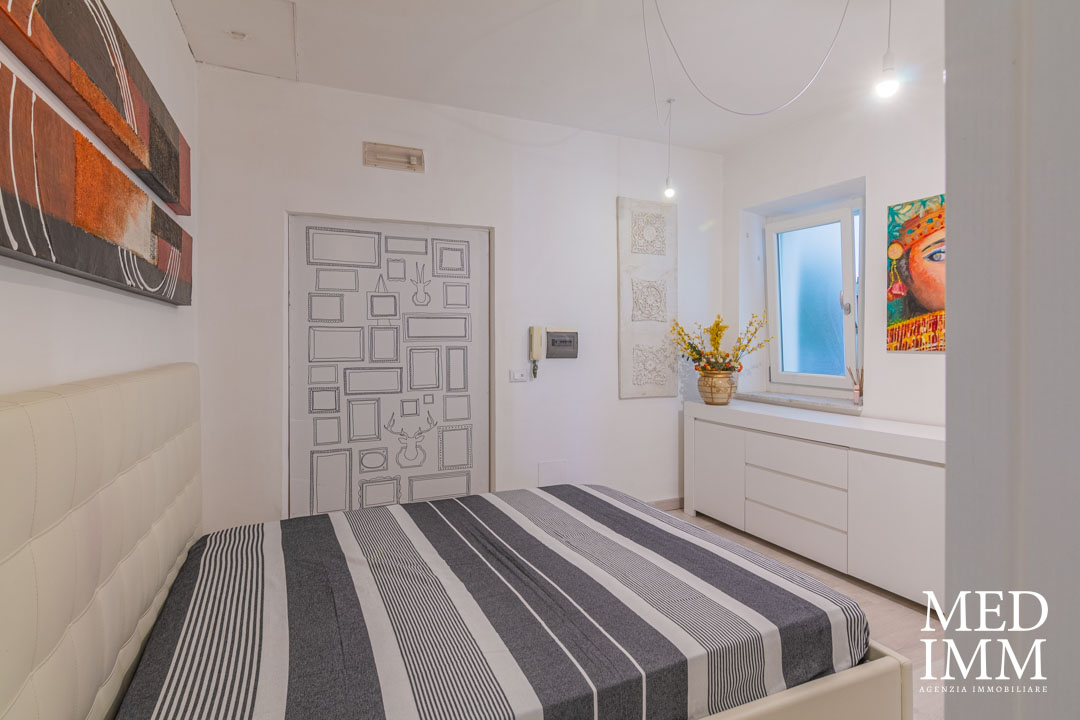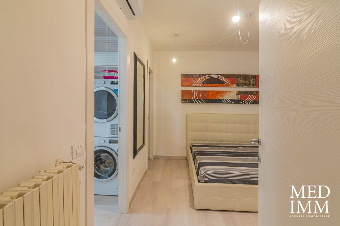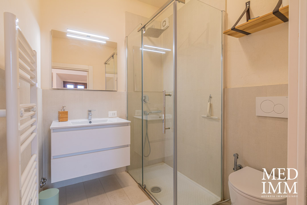 Alla zona notte si accede attraversando uno spazioso disimpegno dotato di divano letto e bagno con doccia walk-in (il bagno ha il termoarredo e l’aeratore).